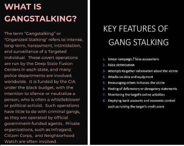 “Gang stalking is a self-harm term for a government no-touch torture and eugenics program.”