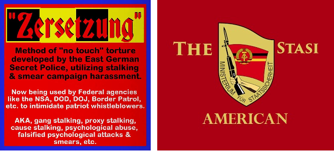 Gang Stalking = Modern-day cyber and community-based, govern-sponsored Zersetzung + COINTELPRO + MK-Ultra + non-consensual human experimentation with “non-lethal” weapons (NLW’s) and mind-control technologies. Overall, Gang Stalking = “No Touch” Torture.