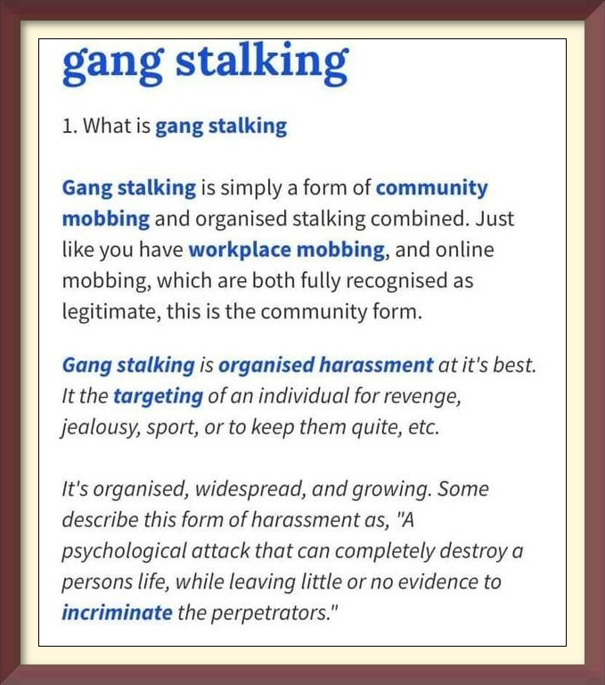 Gang Stalking deprives the targeted individual of their basic constitutional rights and destroys their freedom, setting a stage for the destruction of a person, socially, mental and physical, through a ceaseless assault that pervades all areas of a person’s life.