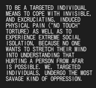 A Targeted Individual (TI) is a person who has become an unwilling victim of gang stalking AKA illegal terrorism operations which cause many types of harm to the person. This includes psychological harm through stalking, psy-ops, manufactured disappointments and disasters in the target’s life, job loss and blacklisting, loss or property, vandalism, slander, diminished health, isolation from family, friends and any support system, and ultimately, loss of life itself. Sometimes physical harm is introduced through biological, chemical, directed energy, electromagnetic and acoustic weapons. The goal of this terrorism is to eliminate the TI through psychological torture, leading to a final solution — their suicide or death. Some targets have been microwaved to death. Some targets have taken their own lives. Some targets have taken their own lives and others at the same time.