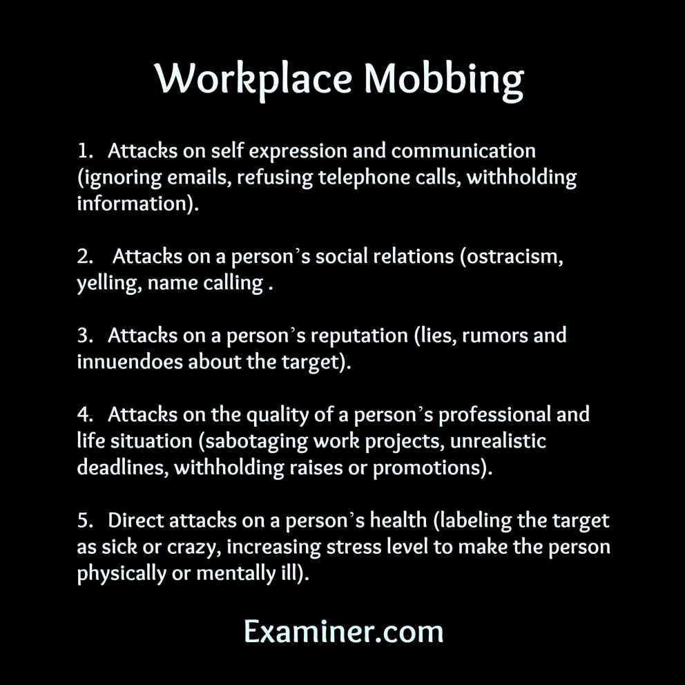 Mobbing, as a sociological term, means bullying of an individual by a group, in any context. Workplace mobbing occurs as emotional (and sometimes physical) abuse in the workplace and involves a “ganging up” by co-workers, subordinates or superiors, to force someone out of the workplace through rumor, innuendo, intimidation, humiliation, discrediting, undermining, sabotage, gaslighting, and isolation. Victims of workplace mobbing frequently suffer from: adjustment disorders, somatic symptoms, psychological trauma (e.g., trauma tremors or sudden onset selective mutism), post-traumatic stress disorder (PTSD), or major depression.